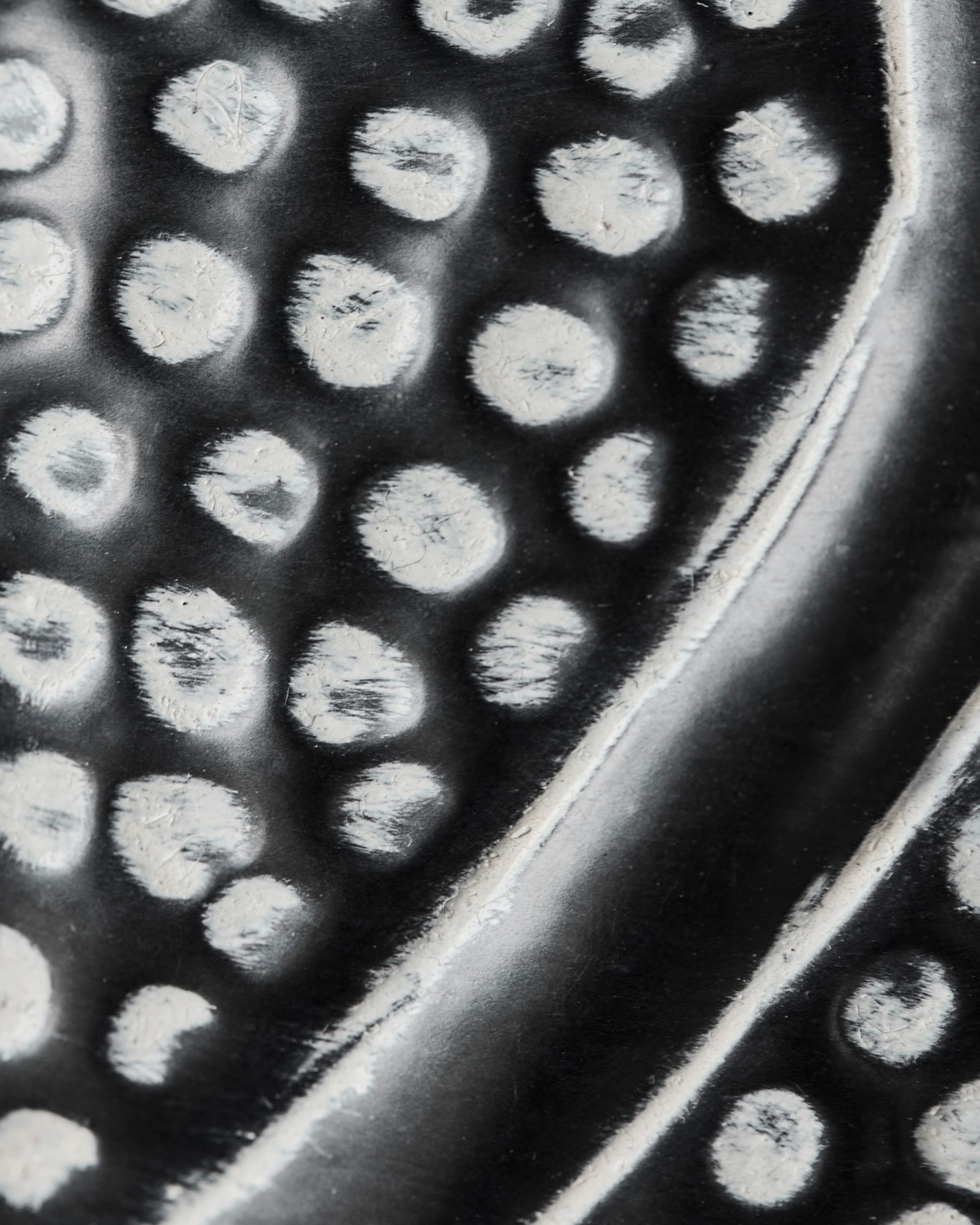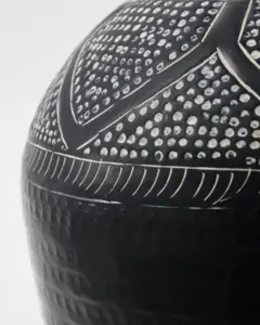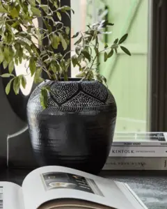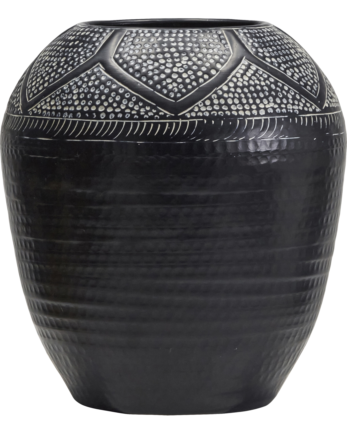 Tilføj et kunstnerisk touch til dit hjem med denne håndlavede vase i sort aluminium. Det smukke embossed mønster gør hver enkelt vase unik og skaber både varme og personlighed. Perfekt til både store blomsterbuketter og grene, denne vase fungerer som et dekorativt midtpunkt i stuen, gangen eller spisestuen.- Håndlavet aluminium vase- Unik embossed mønster- Passer til store buketter- Tilføjer varme til hjemmetLad denne unikke vase blive en del af din personlige indretning.