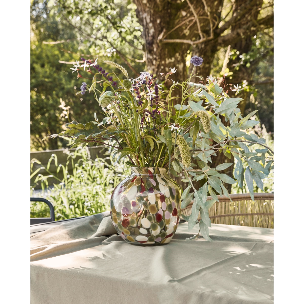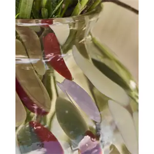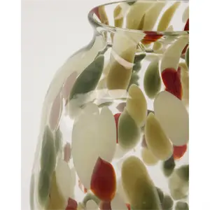 Pryd dit rum med denne udsøgte glasvase, der har en organisk form og dejlige håndmalede prikker i klassiske farver. Den mundblæste vase er et smukt kunstobjekt, der er perfekt til at udstille blomster eller grene og give din indretning et levende præg. - Håndlavet glashåndværk - Unik organisk form -Klassisk flerfarvet design - Ideel til blomster eller grene Tilføj et stænk af kunstnerisk elegance til dit hjem.