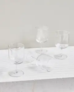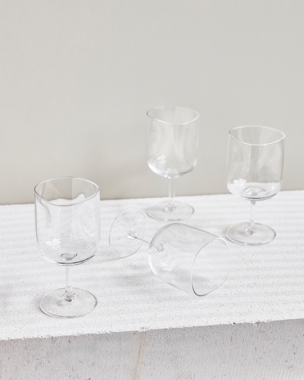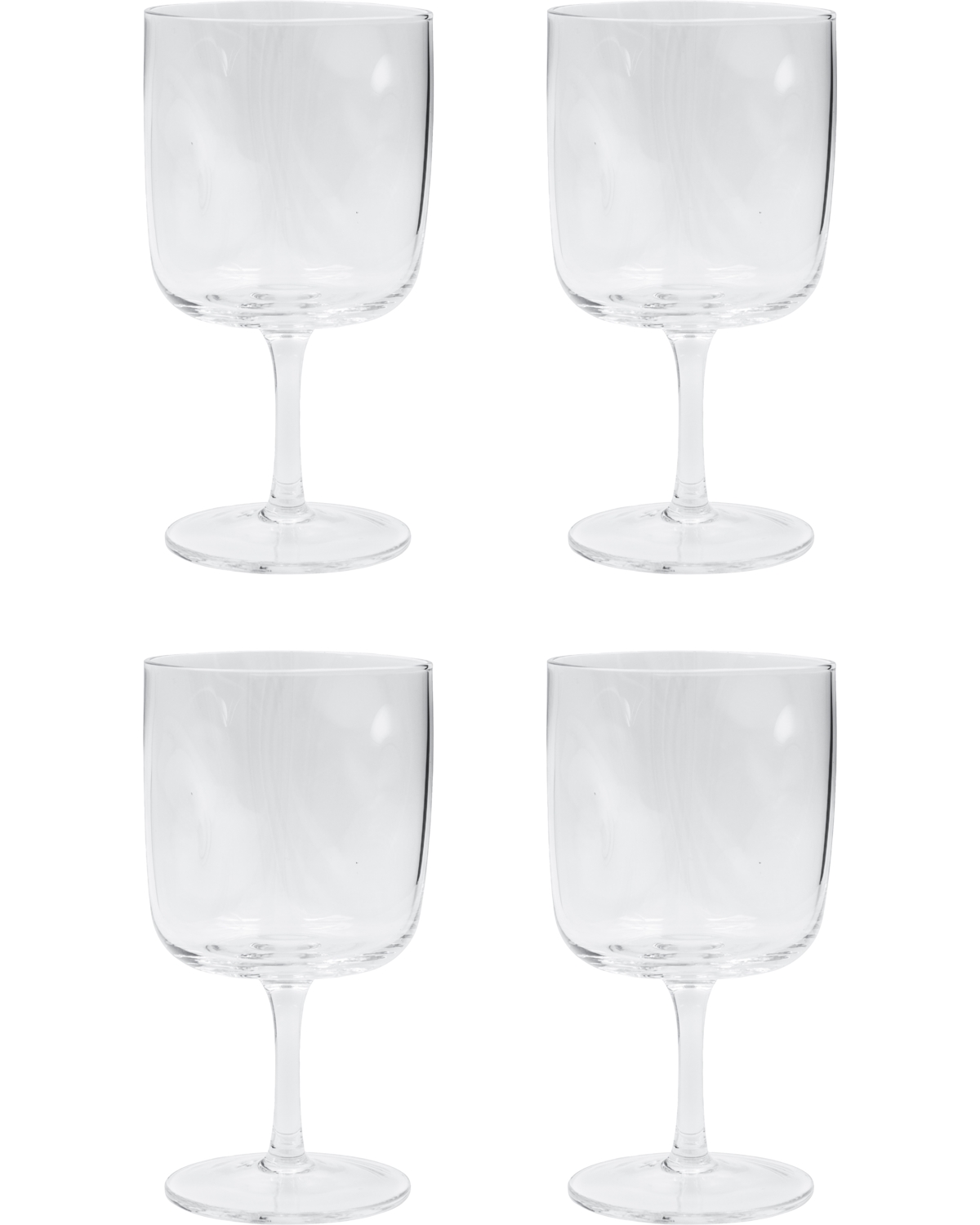 Sæt med fire HDSand-vinglas i klart, mundblæst glas. Den geometriske silhuet og solide form giver et nutidigt og velafbalanceret look.- Sæt med fire.- Moderne geometrisk design- Mundblæst glas.
