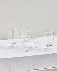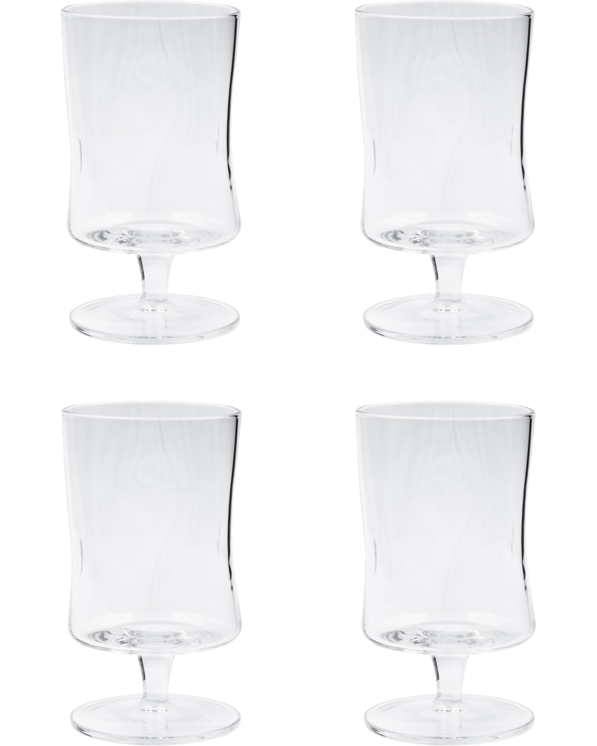 Sæt med fire vinglas. Hvert glas er mundblæst og designet med en struktureret, geometrisk form, der skaber et smukt spil, når lyset reflekteres i overfladen.- Sæt med fire.- Struktureret, geometrisk design.- Kort stilk.