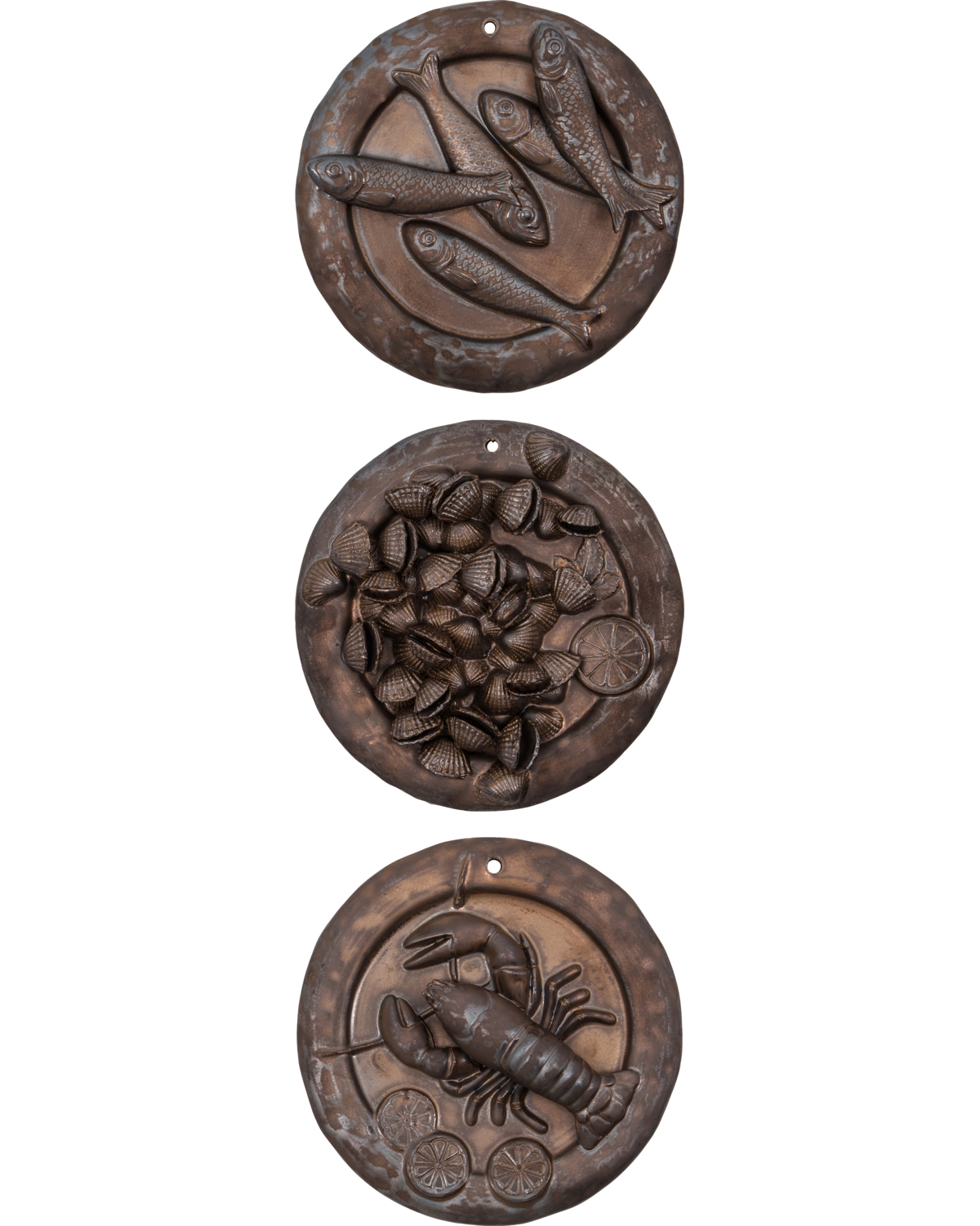 Et sæt med tre håndlavede, runde vægtallerkener i brunt metallisk stentøj giver din bolig et moderne og legende udtryk. Dekorationerne med fisk, hummer og muslinger bringer smilet frem – og skaber samtidig en elegant maritim stemning i stue, køkken eller entré.- Sæt med 3 tallerkner.- Håndlavet i stentøj.- Brunt metallisk glasur.- Kunstnerisk maritimt motiv.Kombiner som sæt, eller bland dem med anden vægkunst for at skabe et personligt look.