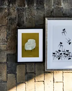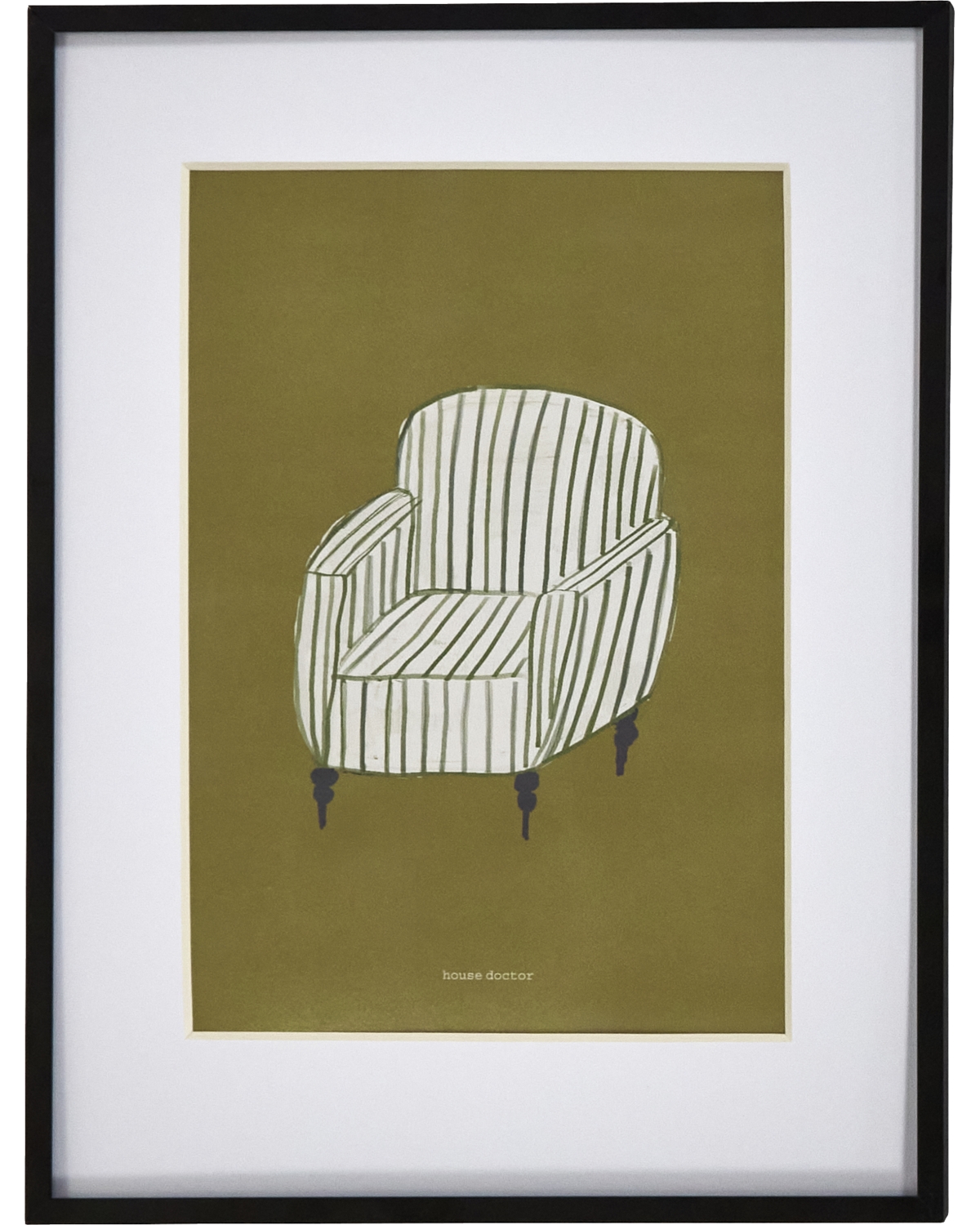 Indfør et strejf af ekspressionistisk charme i din bolig med denne fængslende vægkunst. Med et slående motiv af en stol prydet med grønne striber på en fed sennepsfarvet baggrund giver det et moderne og stilfuldt statement. Den slanke sorte aluminiumsramme med glas, suppleret med en hvid passepartout, fremhæver det centrale billede og tiltrækker opmærksomhed.- Ekspressivt design med levende farver- Sort aluminiumsramme- Perfekt til opholdsrum- Supplerer anden vægkunstSkab en hyggelig og indbydende atmosfære ved at tilføje dette kunstværk til din indretning.