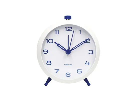 Med sine kompakte dimensioner på 10 cm i højden fylder dette vækkeur ikke unødvendigt på dit natbord eller skrivebord. Jernrammen giver vægt og stabilitet, så uret står sikkert. De blå detaljer mod den hvide baggrund tilføjer karakter uden at dominere, hvilket gør det nemt at kombinere med både klassiske og moderne indretninger.