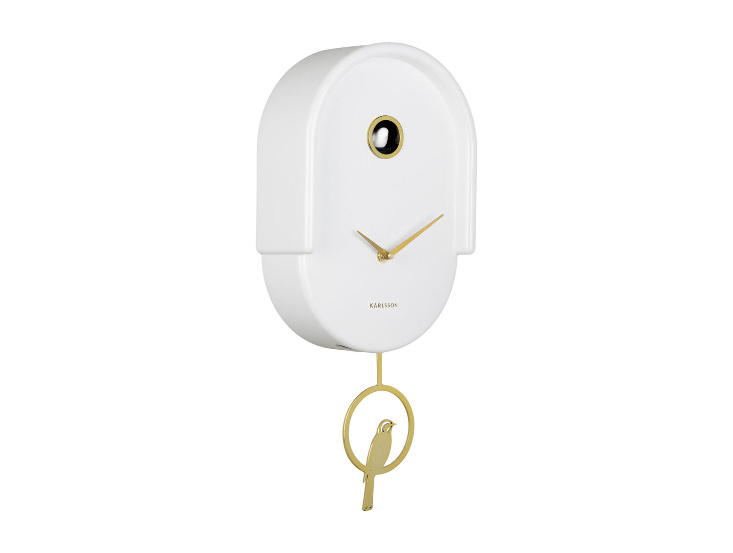 Dette vægur fra Karlsson har en højde på 42 cm, hvilket gør det til et markant element på væggen. Den hvide farve passer ind i de fleste indretningsstile, mens de guldfarvede visere og pendulet med fuglemotiv tilføjer karakteristiske detaljer.