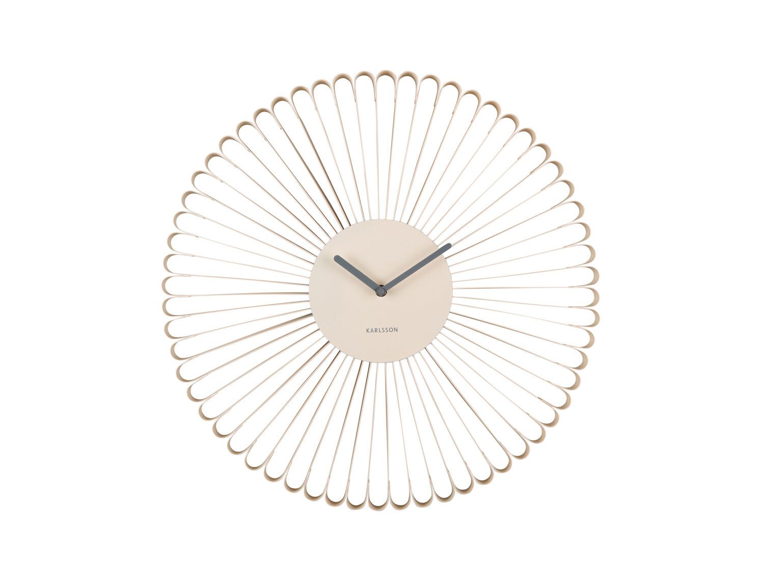 Jernkonstruktionen giver vægt og stabilitet, så uret hænger sikkert på væggen. Materialet sikrer, at den radiære struktur bevarer sin form over tid. Med en dybde på kun 4 cm holder uret sig tæt på væggen, hvilket giver en diskret profil trods den markante diameter. Karlsson-mærket på urskiven bekræfter produktets oprindelse.