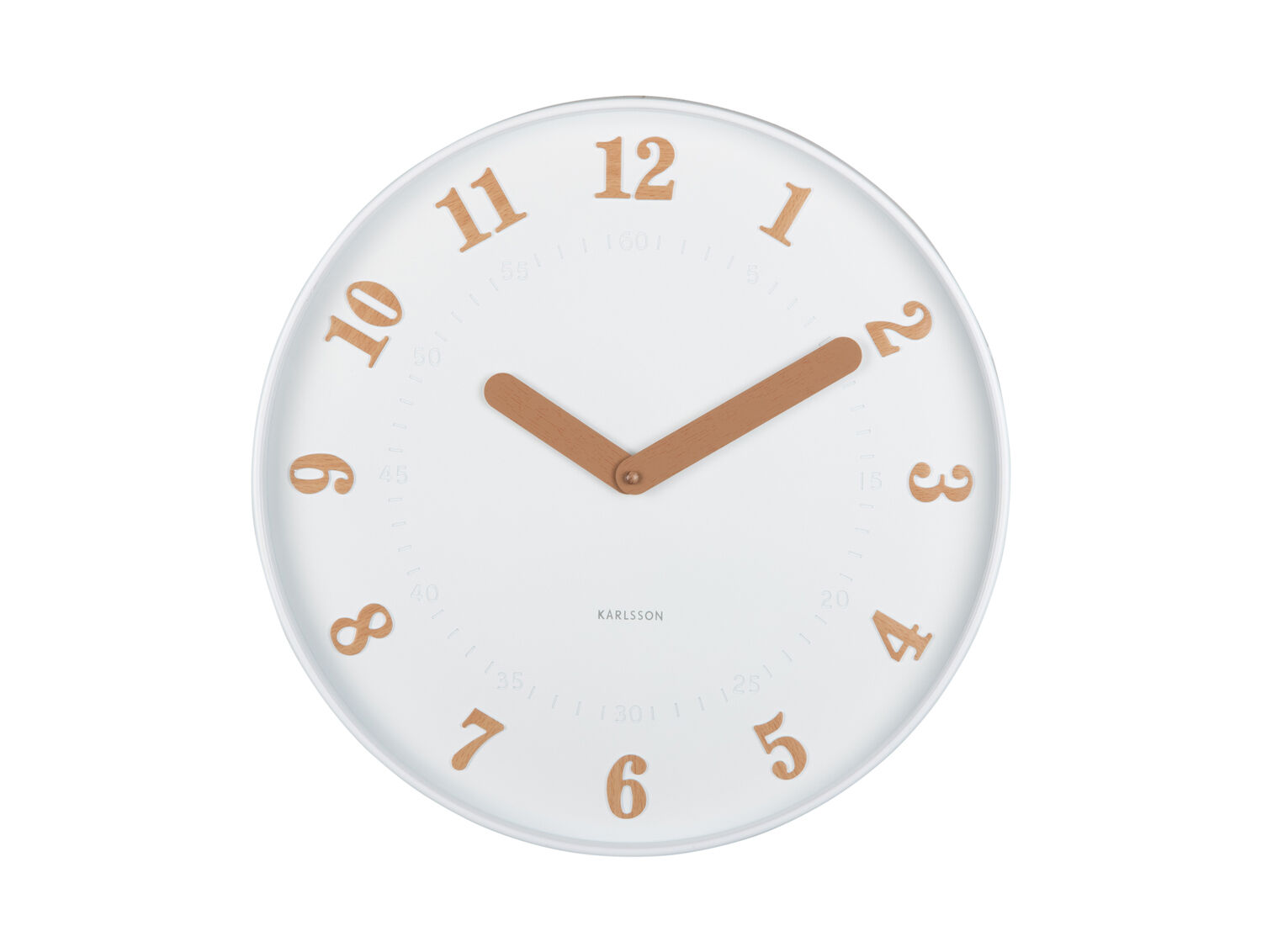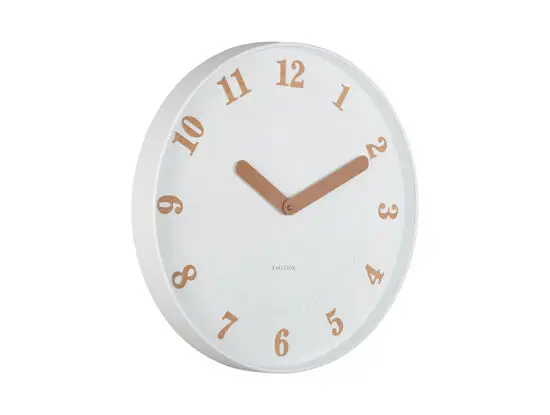 Dette vægur fra Karlsson har en diameter på 40 cm, hvilket gør det let at aflæse fra en afstand. Urskiven er hvid med hævede tal i kontrastfarve, og uret er fremstillet i polypropylen (PP). Med en dybde på kun 4 cm fylder det minimalt på væggen.