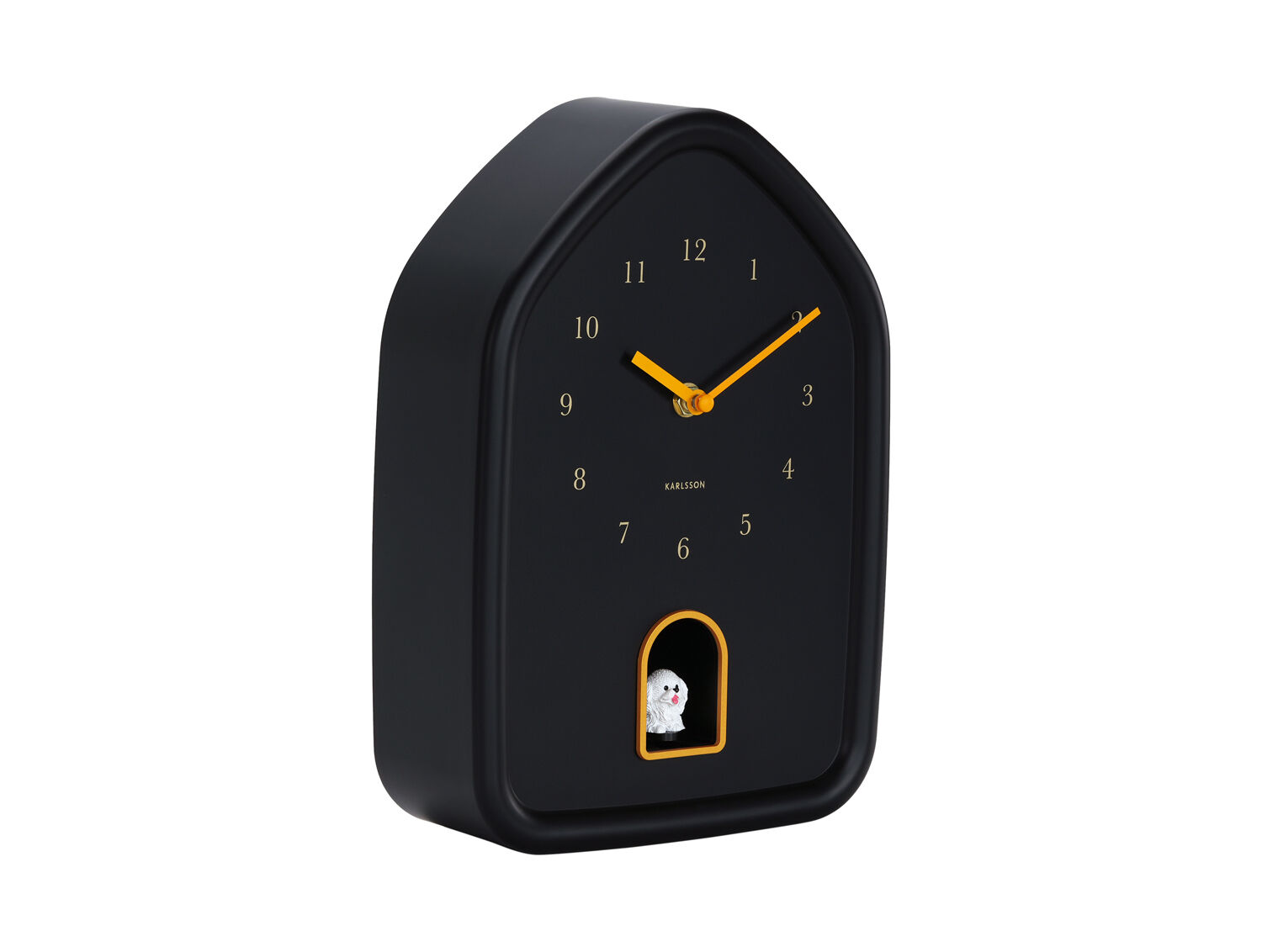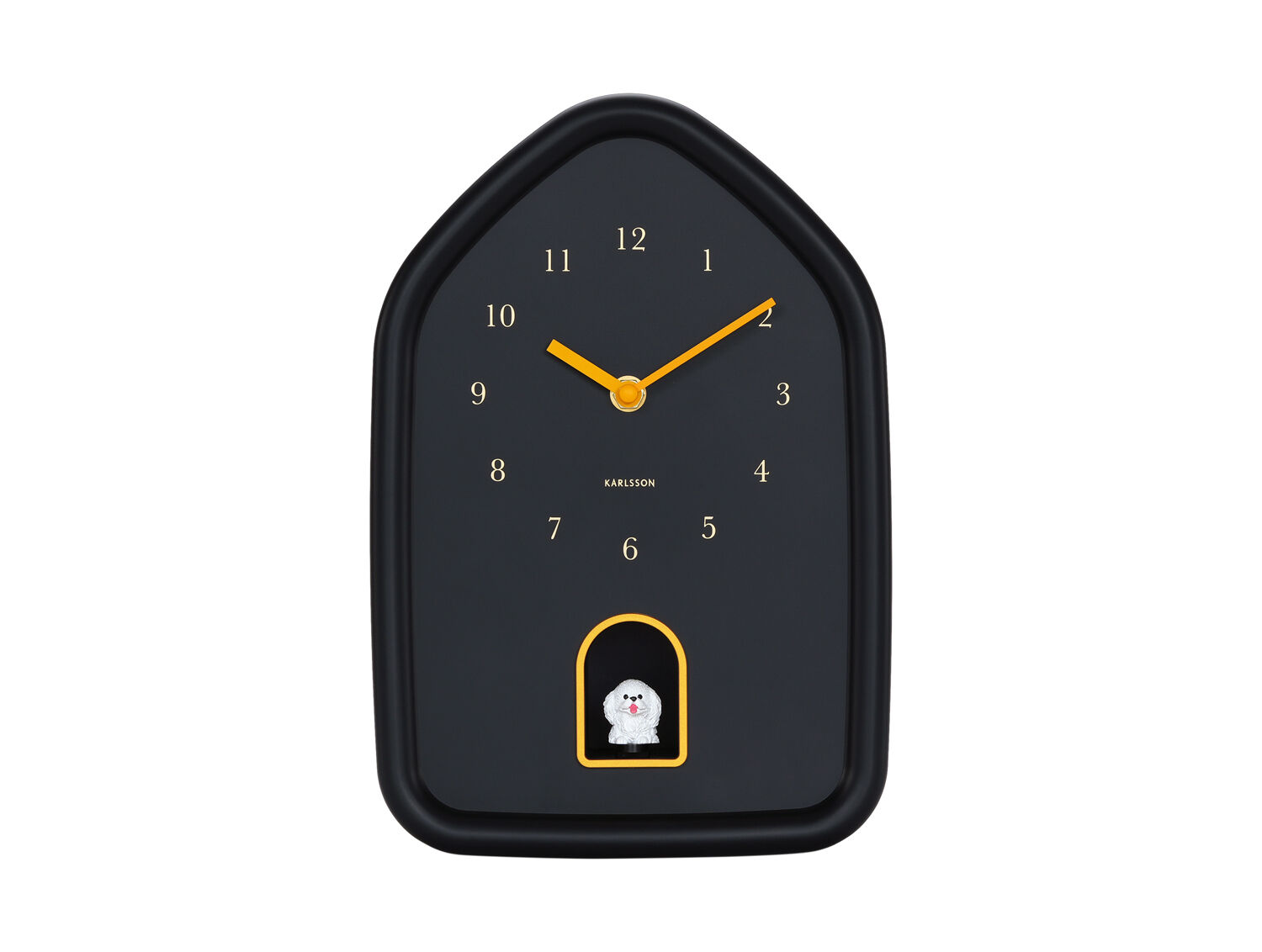 Dette vægur fra Karlsson er fremstillet af polystyren (PS), et materiale der giver både holdbarhed og et moderne udtryk. Det sorte husformede design med buet top skiller sig ud med gule visere og tal på urskiven, mens en hvid hundefigur sidder i en udsparing nederst på uret.