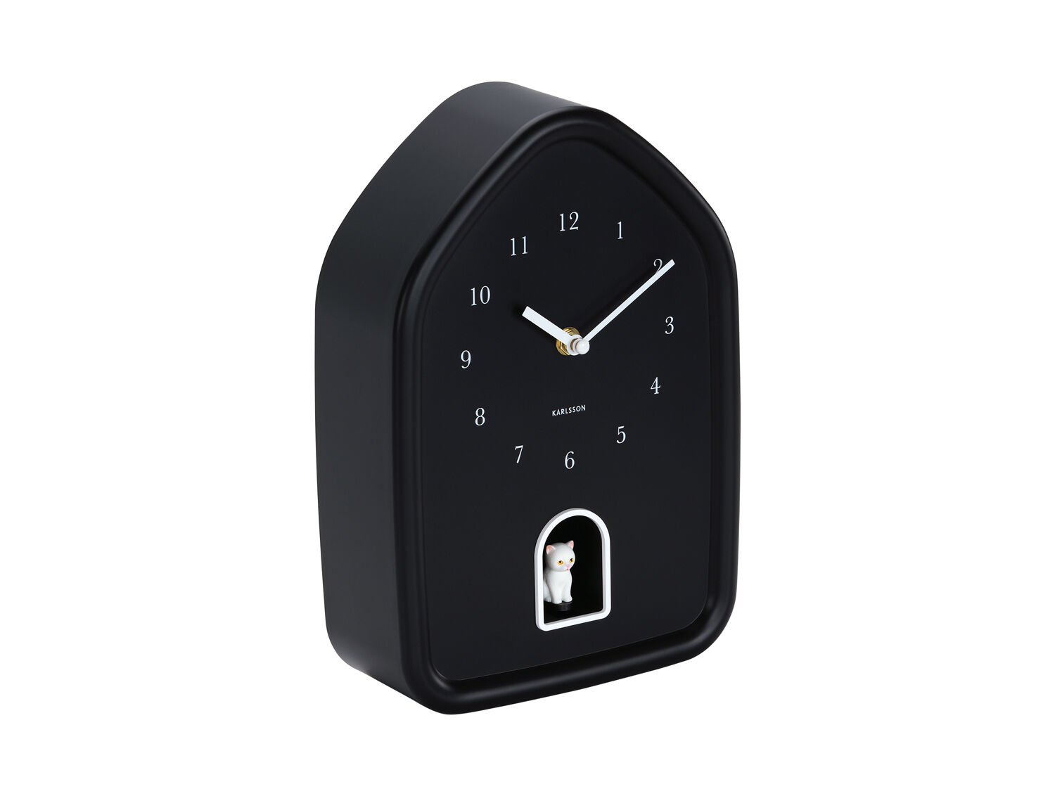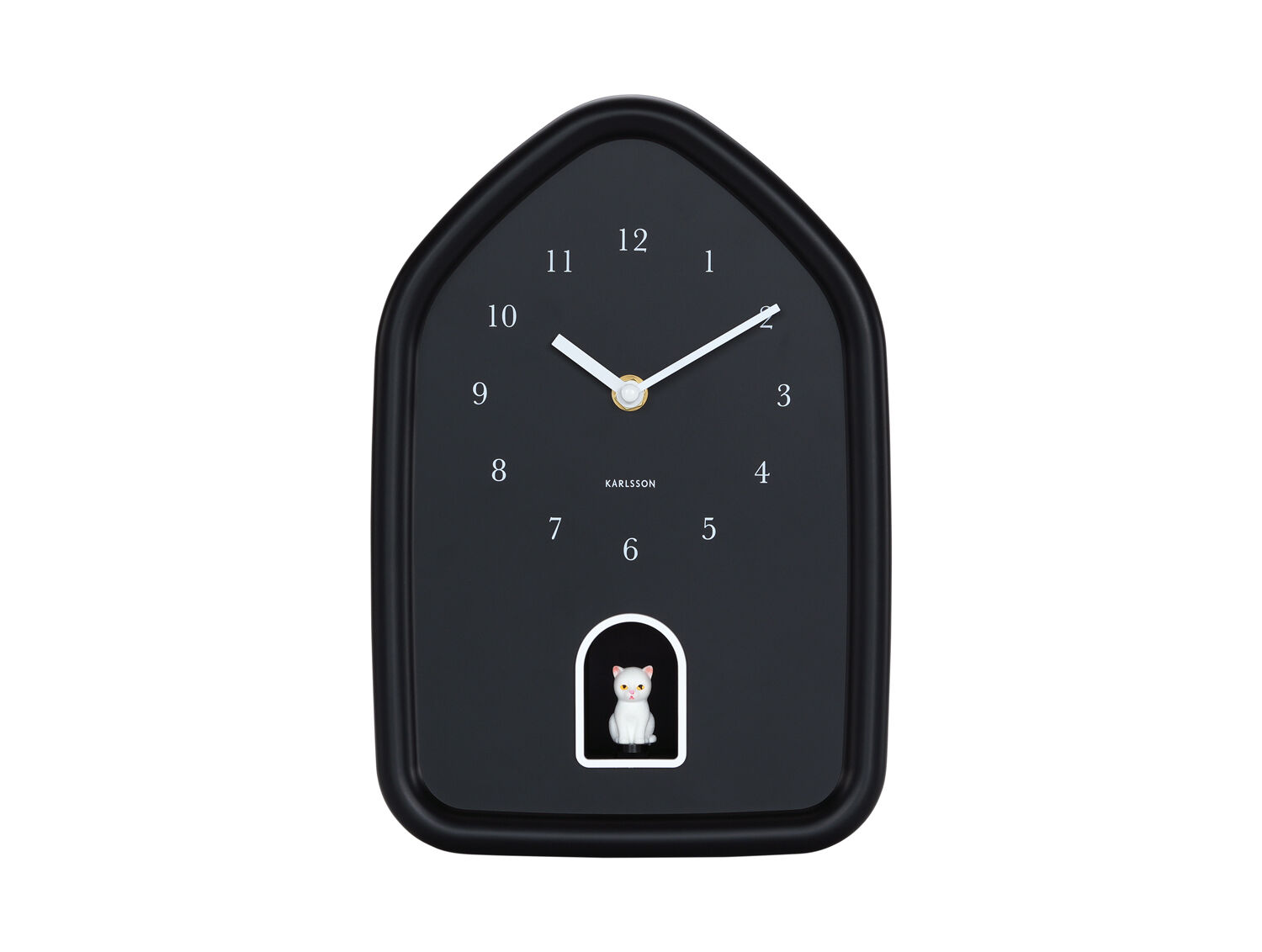 Den sorte urskive med hvide tal og visere gør det nemt at aflæse tiden, mens den lille hvide kattefigur nederst på urskiven giver et sjovt twist. Det husformede design måler 29,1 cm i både længde og højde med en dybde på 7,5 cm, hvilket giver en tredimensionel effekt på væggen uden at fylde for meget.