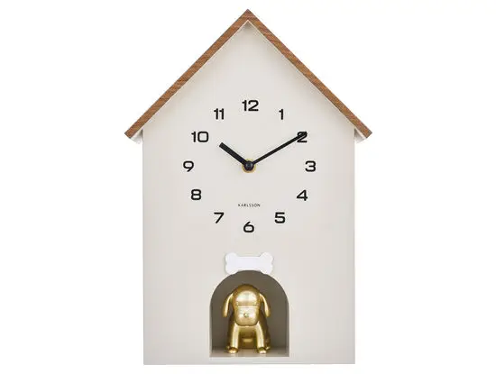 Dette vægur fra Karlsson er formet som et hundehus med et trætag og en lille gylden hundefigur. Den varme grå farve gør det alsidigt, så det passer ind i mange forskellige indretningsstile – fra moderne til hyggelig.