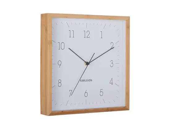 Dette vægur fra Karlsson er fremstillet af bambus, hvilket giver et naturligt udtryk i dit hjem eller kontor. Den kvadratiske ramme omslutter en hvid urskive med sorte tal og visere, der skaber et klart, minimalistisk look.