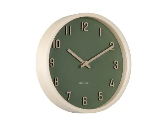 Dette vægur fra Karlsson kombinerer en mørkegrøn urskive med en lys træramme i bøg. Farven giver et stilfuldt element, der passer ind i moderne indretninger, mens de tydeligt markerede tal og visere sikrer god læsbarhed.