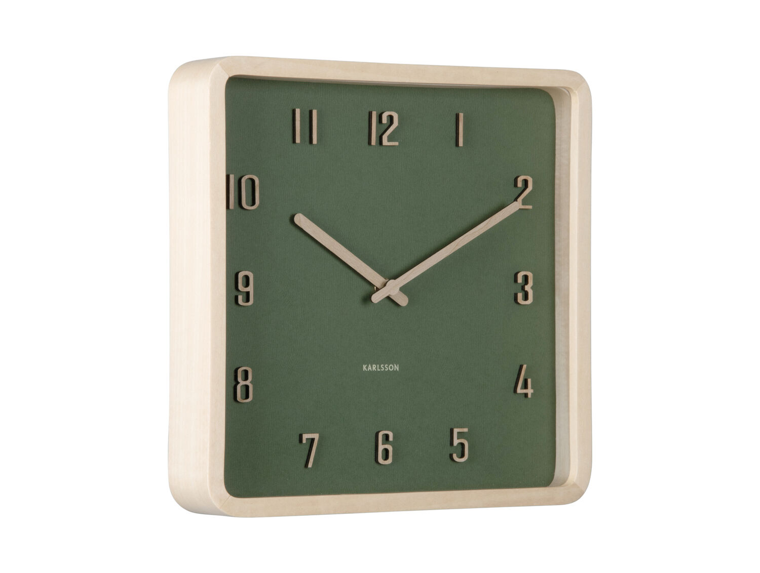 Dette vægur fra Karlsson kombinerer en mørkegrøn urskive med en lys træramme i bøg. Den kvadratiske form måler 26 cm i både bredde og højde, med en dybde på 5,3 cm. Tallene og viserne er tydeligt synlige i en lysere farvetone.