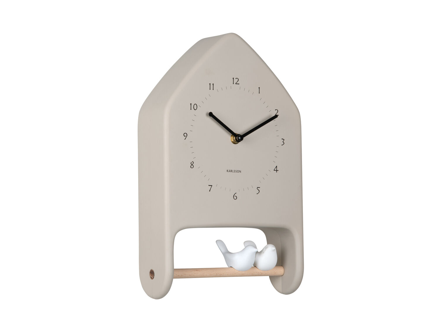 Den varme grå farve fungerer som en neutral base, der harmonerer med både lyse og mørke farvepaletter i hjemmet. De sorte timemarkeringer og visere giver en klar aflæsning, mens de to hvide fuglefigurer på træpinden tilføjer et kunstnerisk element uden at dominere. Urets husform gør det til en iøjnefaldende detalje.