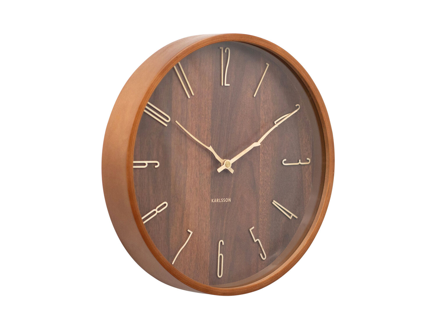 Dette vægur fra Karlsson kombinerer funktionalitet med en naturlig æstetik. De guldfarvede visere og tal gør det nemt at aflæse tiden, selv fra en afstand, hvilket er praktisk i både stuen og kontoret. Uret er lavet af krydsfiner i mørkt træ, som tilføjer varme til rummet uden at dominere indretningen.