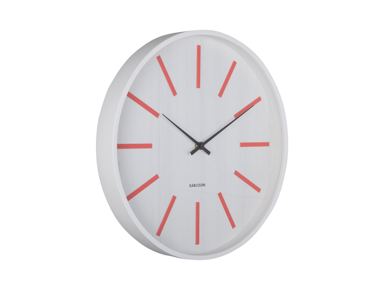 Hvis du har brug for et ur, der er let at aflæse, selv når du befinder dig på den anden side af rummet, er de 40 cm i diameter en fordel. De sorte visere står i kontrast til den hvide urskive, mens de skarlagenrøde markører gør det nemt hurtigt at orientere sig.