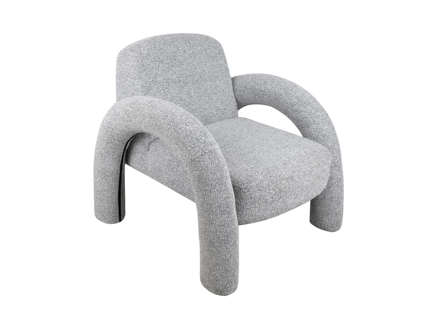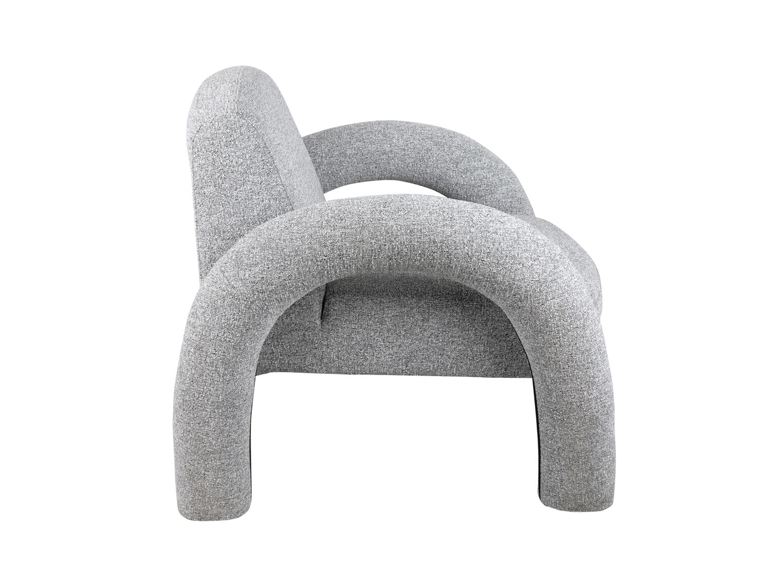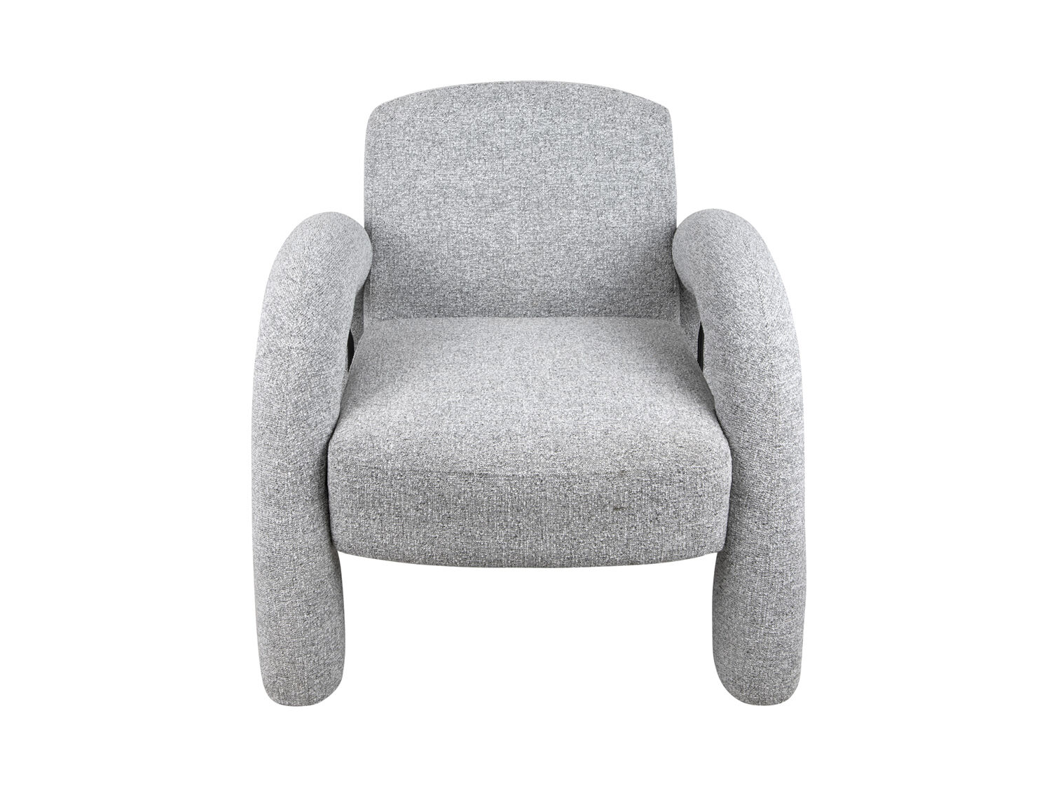 Stolen er lavet af polyester, som er et holdbart materiale, der tåler daglig brug. Den grå melerede tekstur giver stoffet et moderne udtryk, der passer til forskellige indretningsstile. De buede armlæn og ben er ikke kun et designvalg, men tilføjer også stabilitet og komfort under brug.
