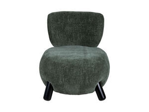 De fire skrå ben giver stolen et moderne udtryk, mens den runde form skaber en blødere æstetik end kantede møbler. Polyestermaterialet er praktisk i hverdagen, og den mørkegrønne farve fungerer som et diskret farvepunkt, der kan supplere eksisterende indretning uden at dominere.