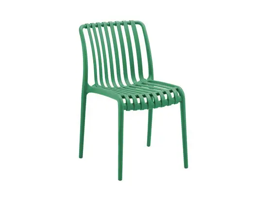 Lamel-sædet og ryglænet giver stolen sit karakteristiske retroudtryk, mens den firebenede struktur sikrer stabilitet på forskellige underlag. Højden på 79 cm passer til standardborde, og den ensartede grønne farve gør stolen nem at kombinere med eksisterende møbler i både moderne og vintageinspirerede indretninger.