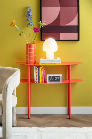 Dette konsolbord fra Leitmotiv er fremstillet af jern, hvilket giver en robust konstruktion, der holder i mange år. Den lyse skarlagenrøde farve tilføjer et dristigt element til dit hjem og skaber et visuelt fokuspunkt, der fanger opmærksomheden.