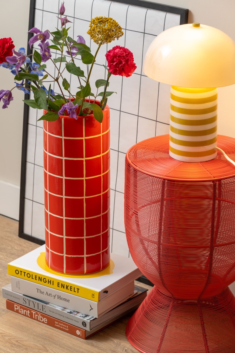 Hvis dit rum føles neutralt eller kedeligt, kan det være svært at finde møbler, der tilføjer personlighed uden at dominere. Den lyse skarlagenrøde farve på dette sidebord giver netop det visuelle løft, du søger. Trådnetdesignet holder bordet visuelt let, så farven tiltrækker blikket uden at fylde for meget.