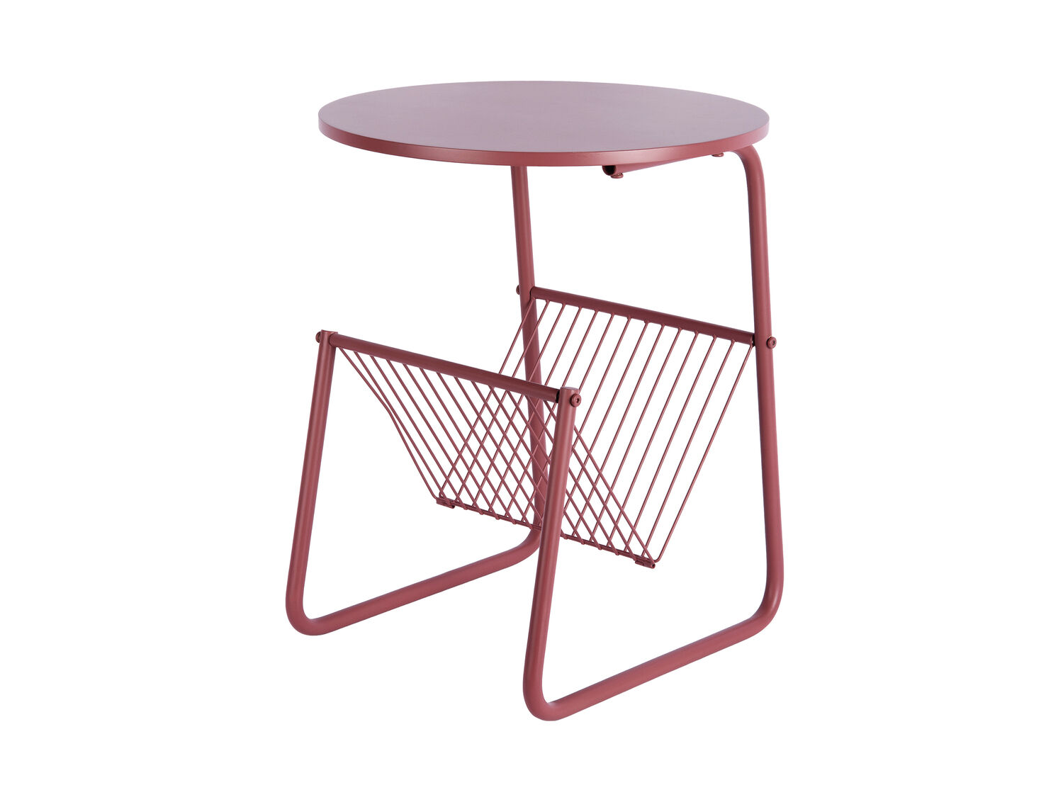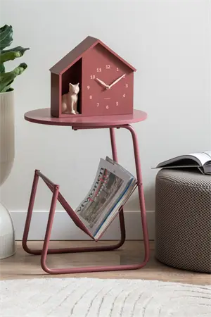 Jernkonstruktionen sikrer stabilitet, selv når du placerer genstande på bordpladen. Den burgunderøde farve giver et farverigt indslag, der skiller sig ud fra neutrale møbler. Magasinholderen under bordpladen giver dig ekstra opbevaringsplads uden at kræve ekstra gulvplads, hvilket gør bordet velegnet til moderne, dynamiske hjem.