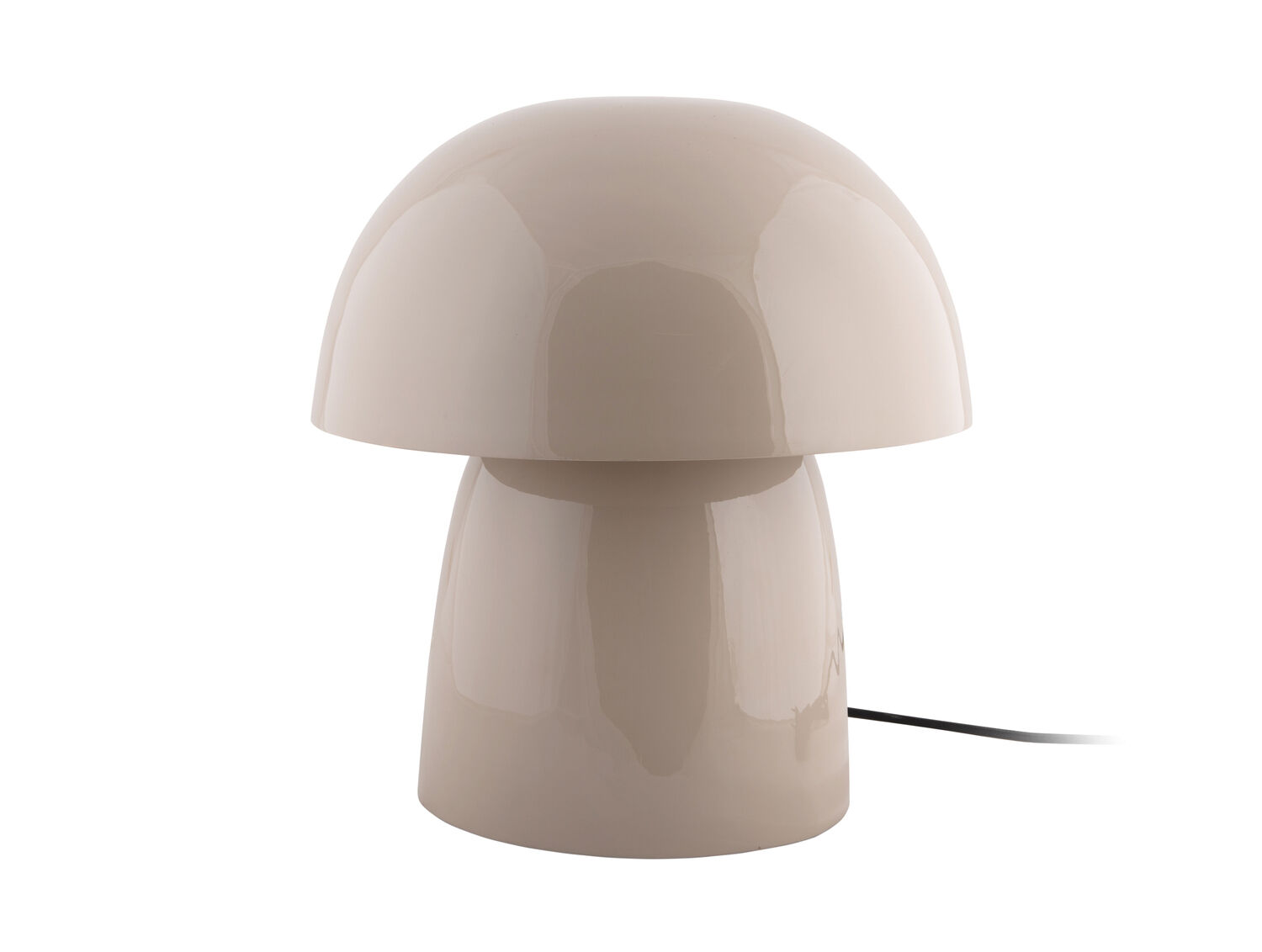 Denne bordlampe skiller sig ud med sin svampeformede struktur, der fungerer som både lyskilde og dekorativt element. Den karakteristiske form giver rummet et moderne udtryk, mens den varme grå nuance med blank finish passer ind i forskellige indretningsstile.