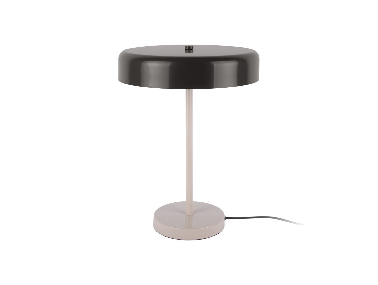 Denne bordlampe fra Leitmotiv har en højde på 40 cm, hvilket gør den velegnet til skriveborde og natborde. Den runde sorte lampeskærm har en diameter på 30 cm og sidder på en slank stander i varm grå. Lampen er fremstillet i jern.