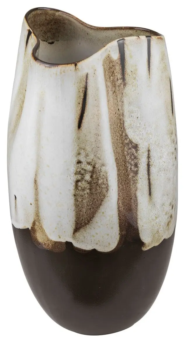 BY HAND curve vase fra Mette Ditmer kombinerer et moderne formsprog med traditionelt håndværk. Den organiske, asymmetriske form giver vasen et legende udtryk, mens den semimatte mørkebrune bund står i kontrast til en blank off-white glasur, der flyder ned over overfladen og skaber bløde overgange i lysebrune nuancer. Glasurens løb og variationer gør hver vase unik.