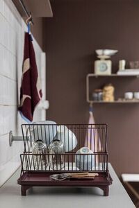 Dette opvaskestativ fra Mette Ditmer byder på en todelt konstruktion, der giver plads til både tallerkener, glas og bestik. Fremstillet i mat, pulverlakeret metal i en dyb vinrød nuance, måler stativet 29 cm i bredden, 42 cm i længden og 32 cm i højden og kombinerer funktionalitet med et stilfuldt udtryk.
