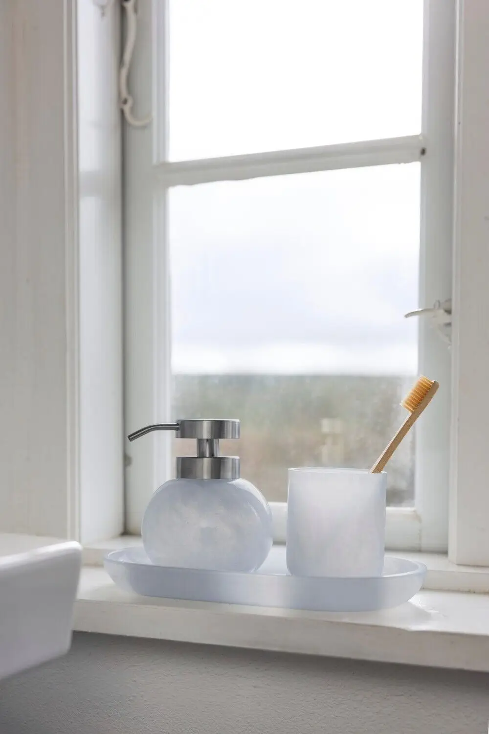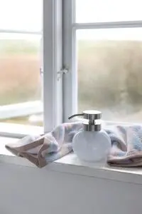 Denne dispenser er fremstillet af opalglas og metal, hvilket giver dig et badeværelsestilbehør, der holder i mange år. Opalglasset tilføjer en blød transparens og subtil dybde, der skaber visuel interesse uden at dominere. Den børstede stålpumpe fremhæver den lyseblå farve og sikrer en funktionel dosering af sæbe.