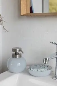 Denne sæbeskål er fremstillet af opalglas, et kvalitetsmateriale, der giver en sofistikeret æstetik til dit badeværelse. Den lyseblå farve fremhæver skålens organiske form og tilføjer et friskt udtryk, der passer ind i moderne indretning. Det bløde, transparente glas med subtil dybde giver en visuel lethed, som kan løfte dit badeværelses overordnede udtryk.