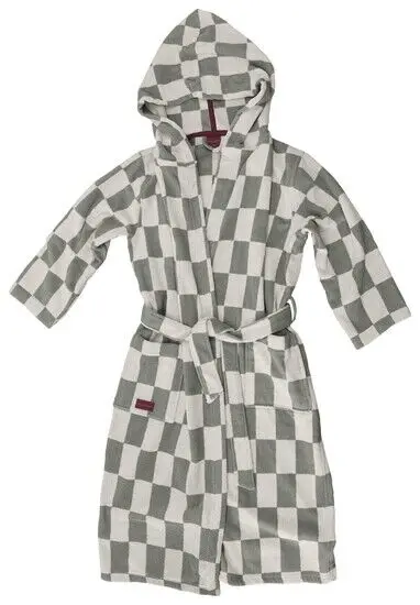Denne badekåbe fra Mette Ditmer kombinerer et ternet mønster i salviegrøn og off-white med praktisk funktionalitet. Den er syet i 100 % bomuldsfrotté og er OEKO-TEX® STANDARD 100-certificeret, hvilket betyder, at materialet er testet og frit for skadelige stoffer.