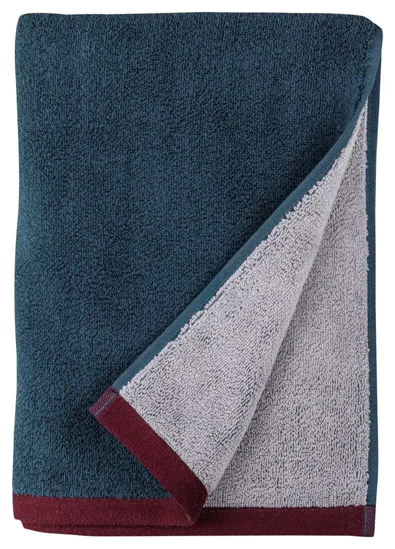 En vinrød bort skaber en balanceret kontrast og binder farverne sammen. Det rolige design rummer en subtil leg med farver, der gør håndklædet visuelt interessant uden at virke larmende. 100 % økologisk bomuld, OEKO-TEX® 100-certificeret.