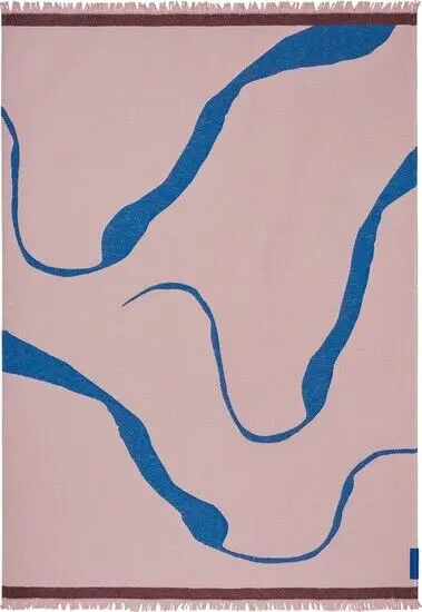Dette throw måler 130 cm i bredde og 175 cm i længde, hvilket passer til de fleste sofaer og senge. Mønstret viser blå, bølgende linjer på en lyserød baggrund, og koboltblå penselstræk skaber rytme og balance i designet.
