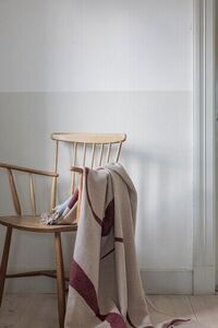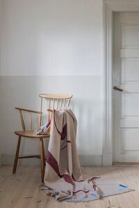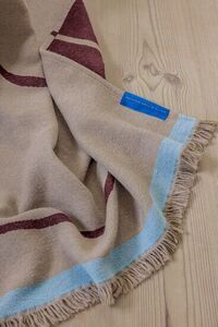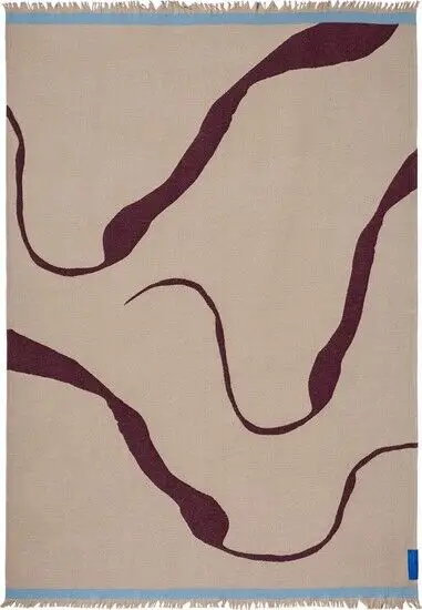 Dette tæppe fra Mette Ditmer har et abstrakt mønster i vinfarve på en beige baggrund. Det måler 130 cm i bredden og 175 cm i længden, hvilket gør det praktisk til sofaen eller som et let tæppe.