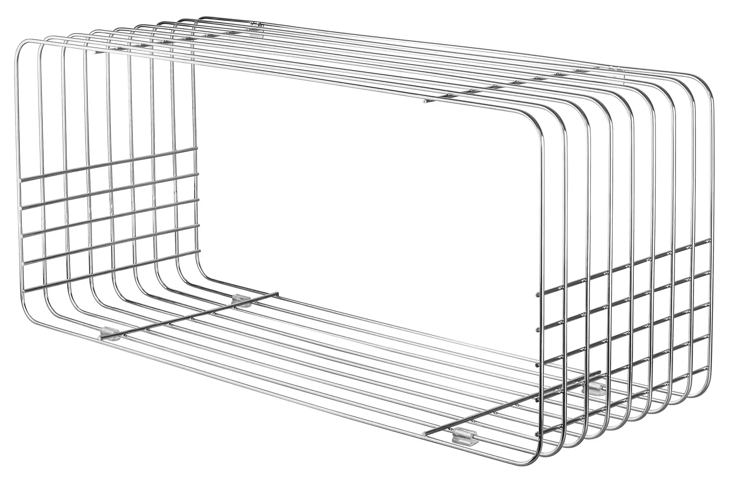 Denne reol er fremstillet af kromfarvet metaltråd, der danner en åben rektangulær struktur. Designet giver et moderne udtryk, mens materialets robusthed sikrer langvarig anvendelse. Med mål på 26 x 70,5 x 31 cm passer den ind i forskellige rum og fungerer både som opbevaring og som dekorativt element.