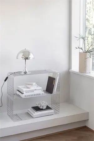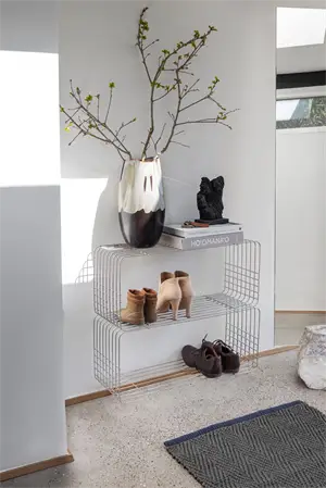Hvis du mangler en opbevaringsløsning, der ikke fylder visuelt, men stadig giver struktur, er denne reol relevant. Den åbne trådkonstruktion skaber gennemsigtighed, så rummet bevarer sin luftighed. Ideel til sko, bøger eller håndklæder, hvor du ønsker både funktionalitet og et stilrent udtryk.
