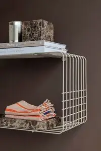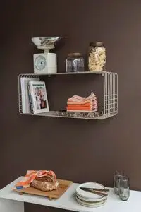 Den matte sandfarve matcher neutrale farveskemaer og skaber ro i indretningen. Med en bæreevne på 5 kg kan du opbevare bøger, glas eller dekorative genstande uden bekymring. De medfølgende fødder og samlingsbeslag gør installationen ligetil, uanset om du vælger væg eller gulv. Metaltråden kræver minimal vedligeholdelse.