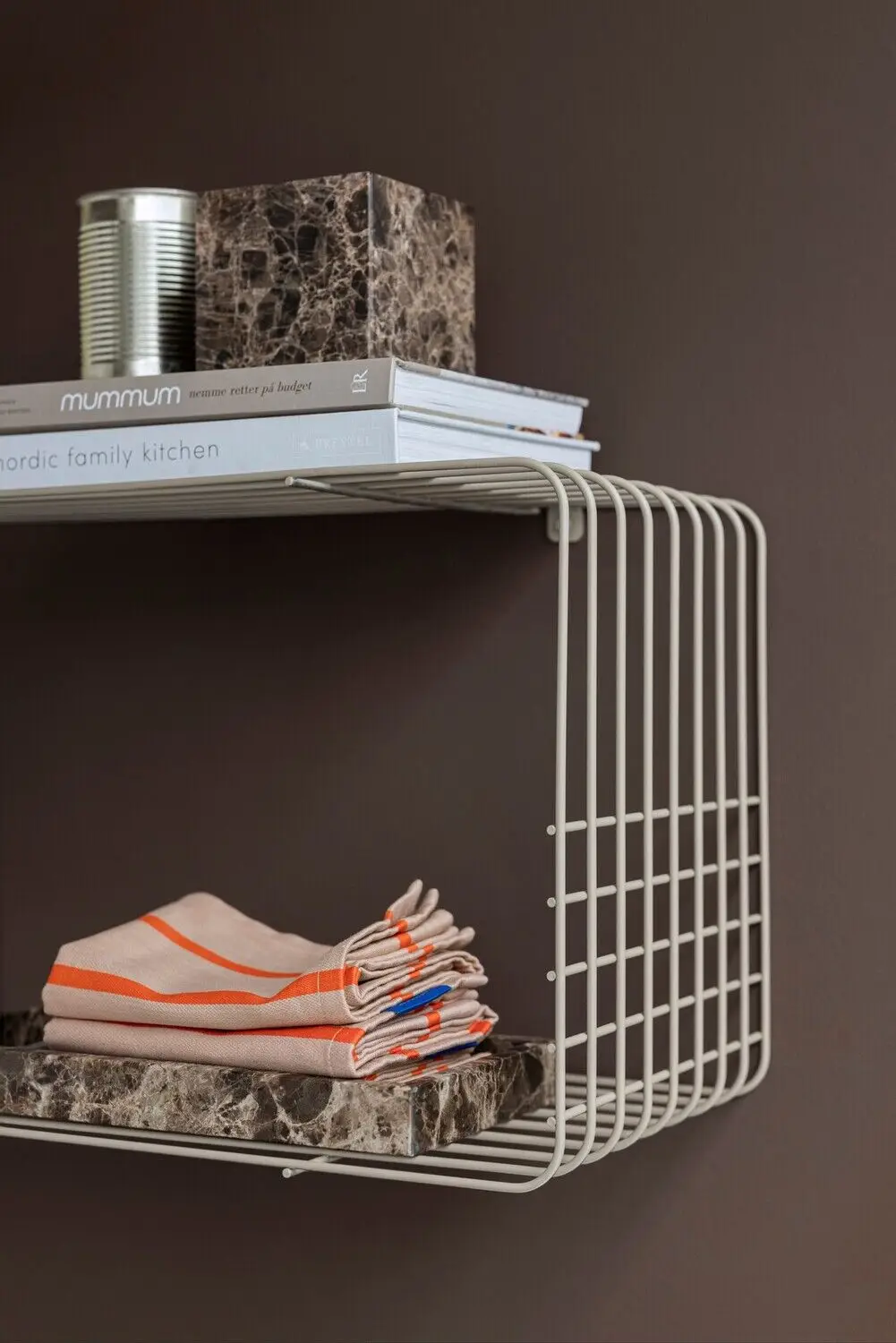 WIRE rack er en funktionel reol i metaltråd med en mat sandfarvet overflade. Den åbne struktur giver et let udtryk, der passer til moderne indretning. Du kan montere den på væggen eller lade den stå på gulvet, så den tilpasser sig dine behov.