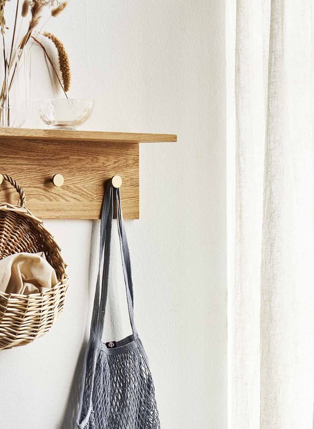 Hylden tilbyder praktisk opbevaring med sin kombination af en solid overflade og robuste messingknager. Den naturlige egetræsfinish giver et varmt udtryk, mens de gyldne knager tilfører et strejf af elegance. Designet er nøje gennemtænkt for at maksimere funktionaliteten uden at gå på kompromis med æstetikken. Den solide konstruktion gør hylden velegnet til forskellige formål i hjemmet, såsom opbevaring af nøgler og post i entréen, ophængning af køkkenredskaber i køkkenet eller håndklæder på badeværelset.