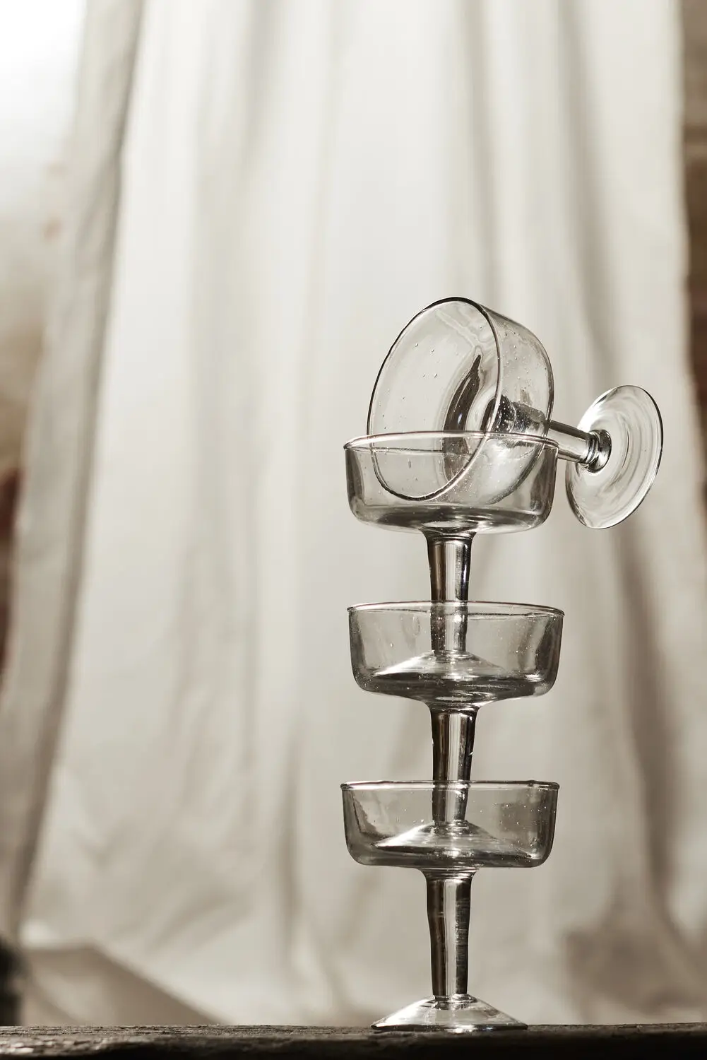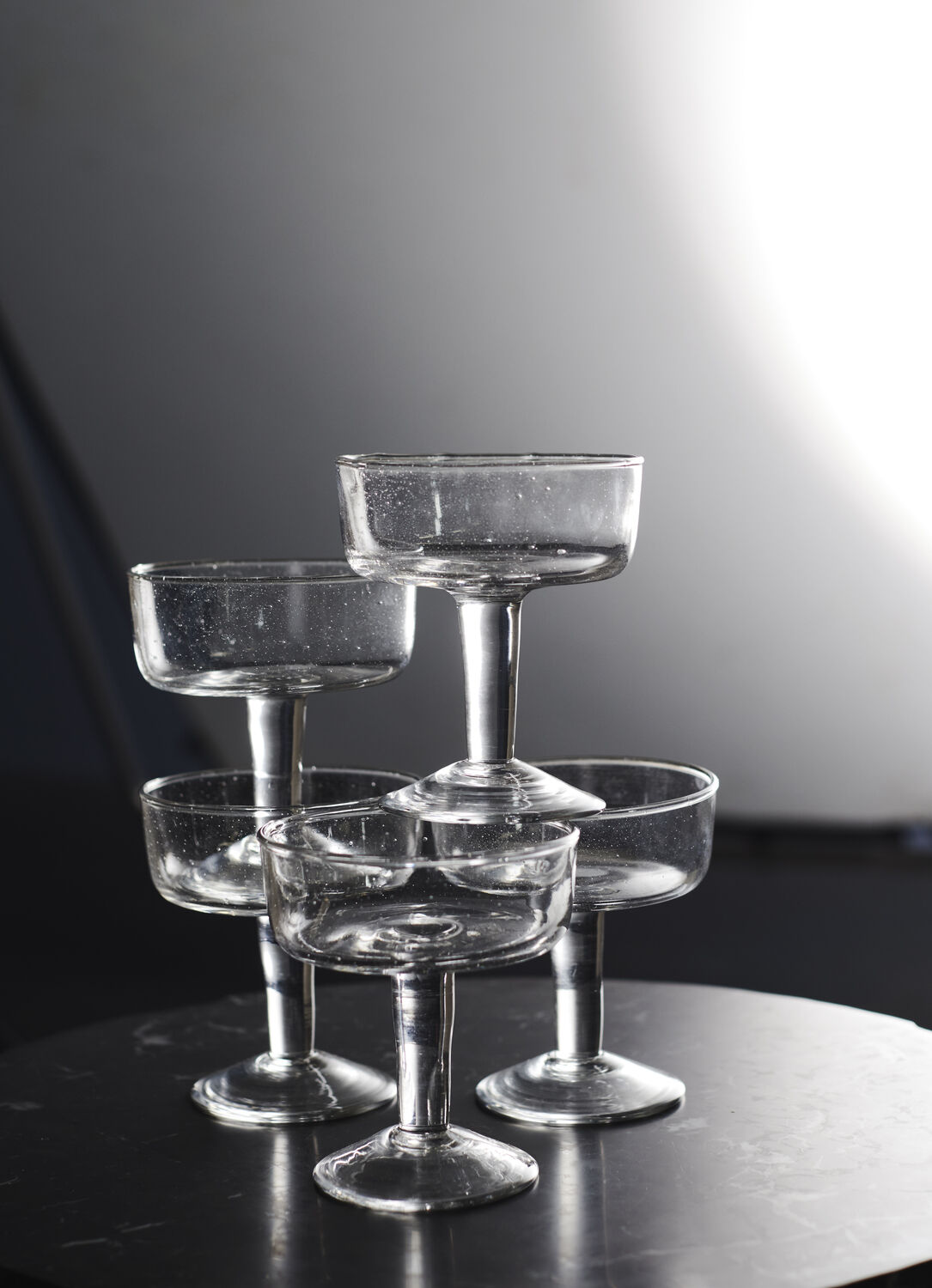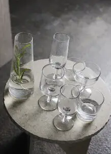 Glassene er mundblæste og fremstillet af 100% genbrugsglas, i et karakteristisk og robust design, der giver et løft til enhver borddækning.