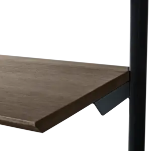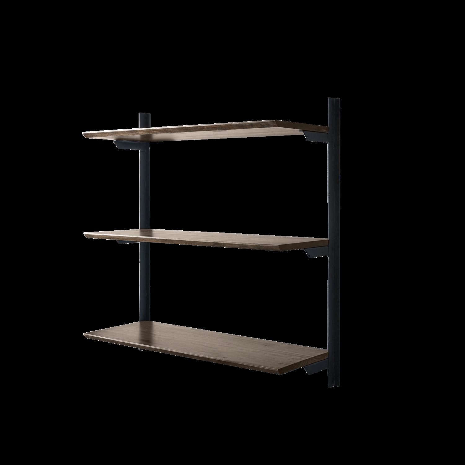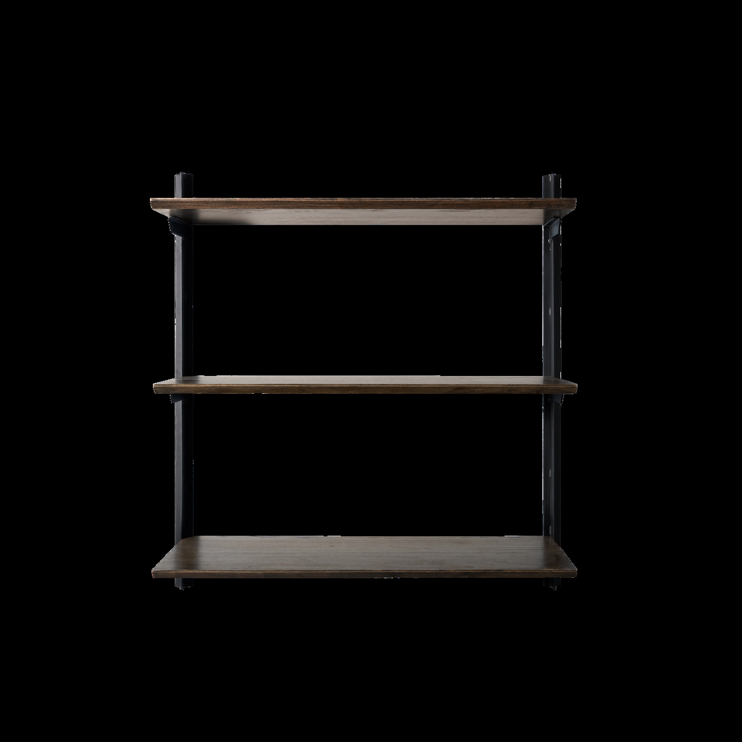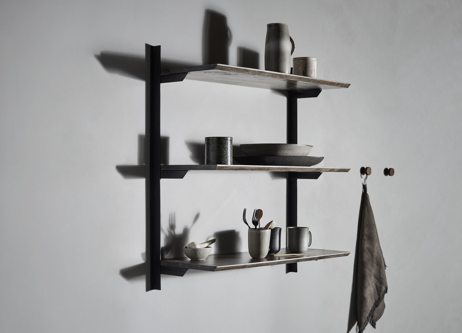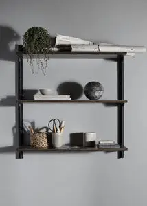 Hylden er designet med tre hylder i gummitræ og en ramme i sortmalet stål, hvilket giver et råt udtryk. Hylderne er olieret med mørk olie for at tilføje kant og dybde til overfladen.