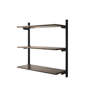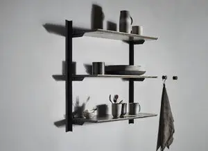 Hylden fastgøres til væggen med skinner som hylderne efterfølgende monteres på. Skruer til ophæng medfølger.