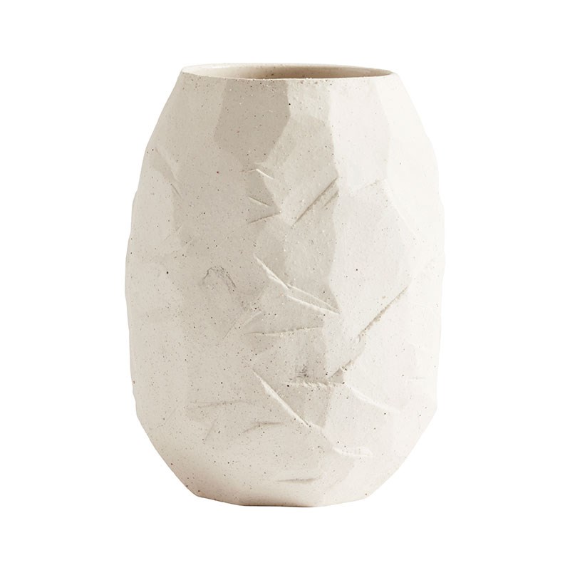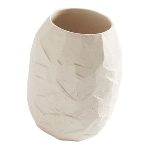 Den smukke vase er skabt fra bunden ud af en klump ler og formen er skabt med simple udskæringsværktøjer. Indersiden er glaseret med blank glasur, som skaber en smuk kontrast, men som også sikrer at vasen er vandtæt.
