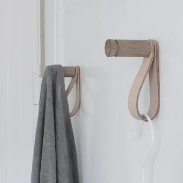 Denne flotte og elegante lille knage er drejet i egetræ, hvor der er fræset en lille rille for enden. Derudover er der en læderstrop, hvori der kan hænges en bøjle eller to. Hæng flere knager dekorativt ved siden af hinanden eller hæng dem enkeltvis. Knagen passer også perfekt til at sætte bag en dør. Skruen går 3 cm ind i væggen.
