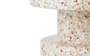 Det spættede mønster i hvide, brune og rødlige nuancer giver hver skammel et unikt udtryk. Det cylindriske design med tre sektioner skaber en skulpturel effekt, der adskiller sig fra almindelige skamler. LDPE-materialet sikrer, at overfladen holder til daglig brug.