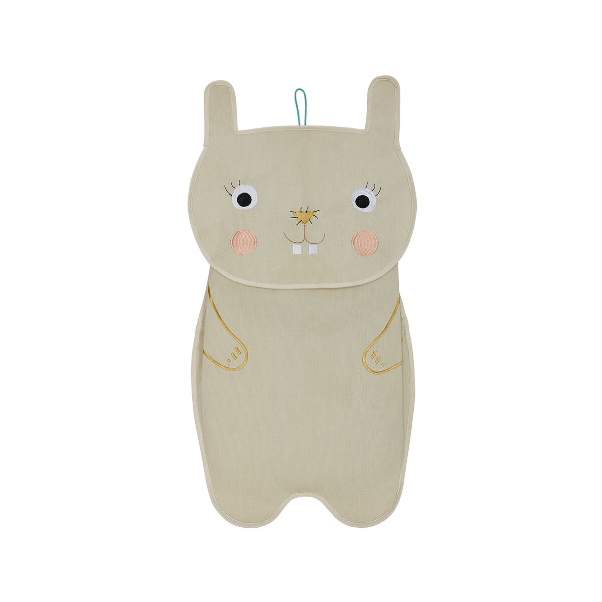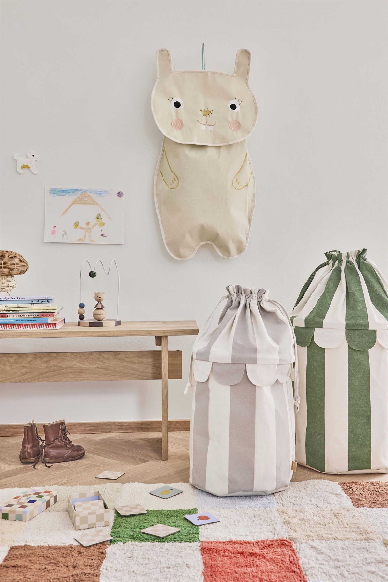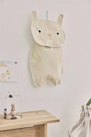 Denne charmerende opbevaringsløsning kombinerer praktisk funktion med et sødt kanindesign. Med broderede detaljer som øjne, smil og røde kinder på den beige baggrund skaber den et indbydende udtryk i ethvert rum.