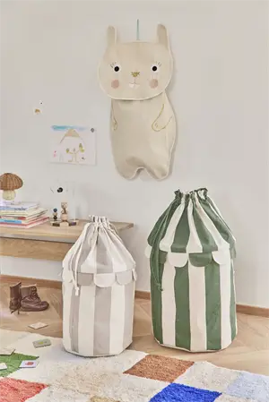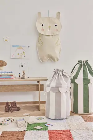 Den beige grundfarve med gule og pink detaljer gør det nemt at integrere opbevaringen i forskellige indretningsstile. Kanindesignet tilføjer et legende element, mens den praktiske størrelse giver god plads til legetøj og andre småting.
