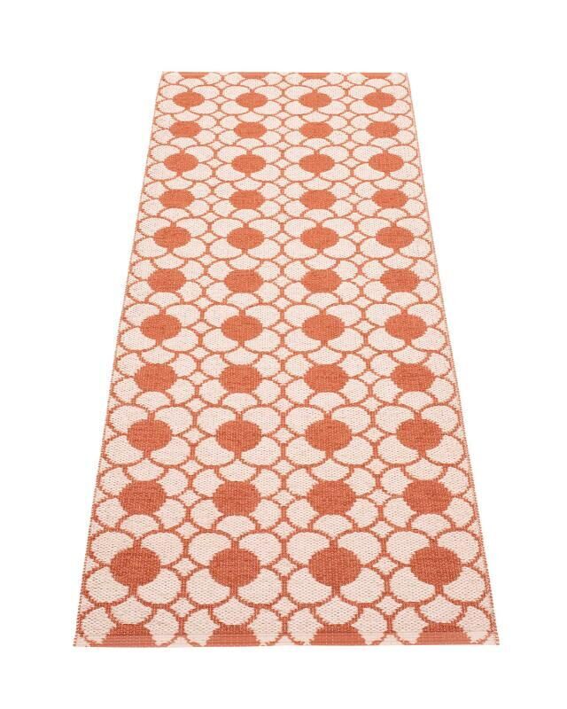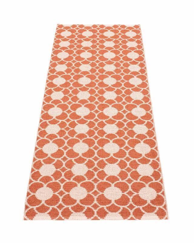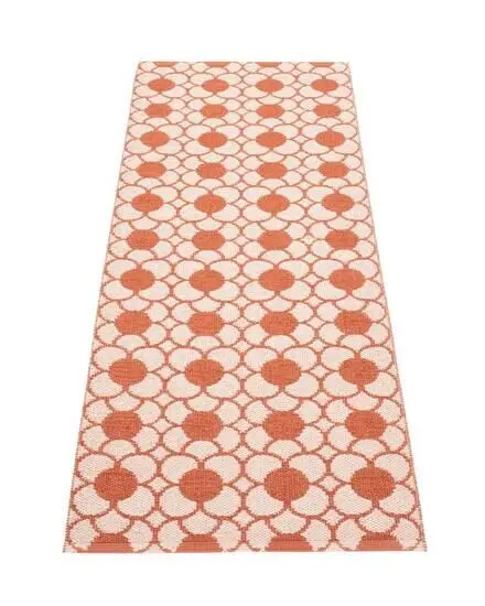 Dette tæppe fra Pappelina måler 70 x 200 cm og passer til smalle områder i dit hjem. Den flade vævning gør det nemt at placere under døre, og det geometriske mønster med cirkulære former i murstensfarve tilføjer visuelt liv til gangene eller ved siden af sengen.