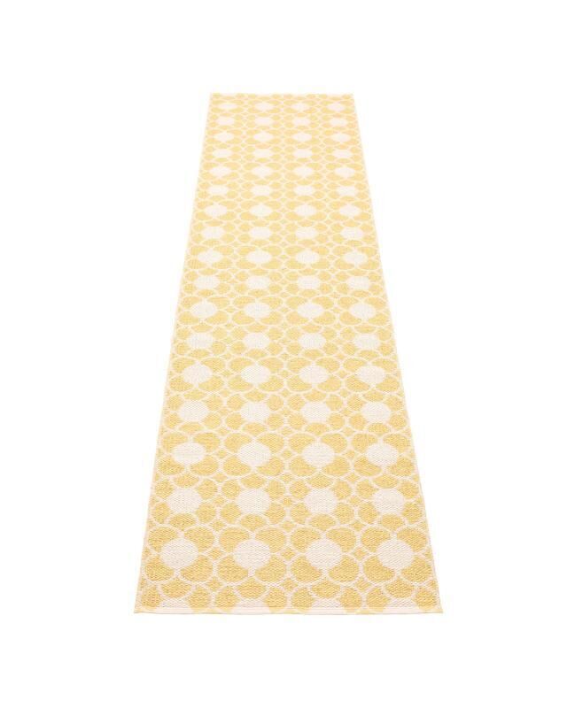 Dette tæppe fra Pappelina kombinerer lysegul og hvid i et geometrisk mønster med cirkler og linjer. Farverne skaber et lyst udtryk, der fungerer godt i moderne indretninger, hvor du ønsker en frisk atmosfære uden at dominere rummet.